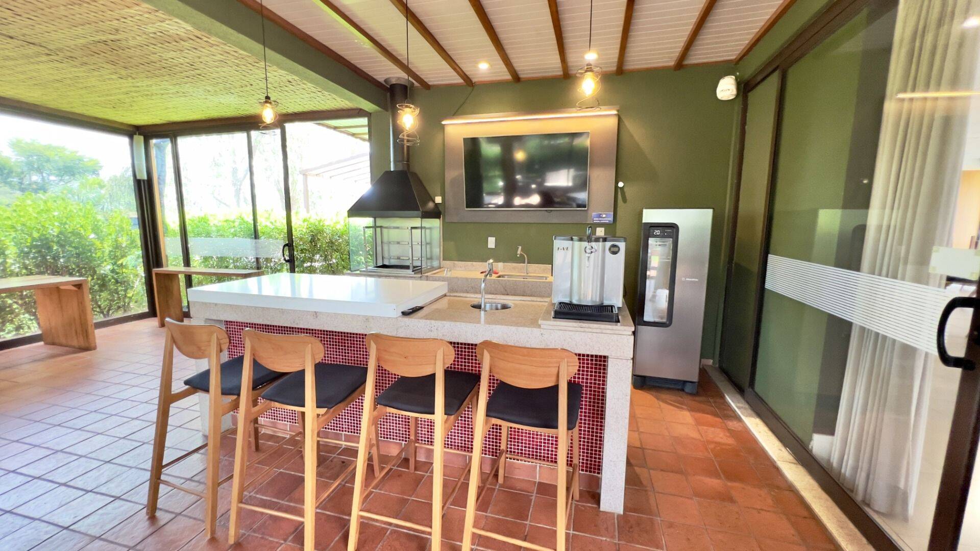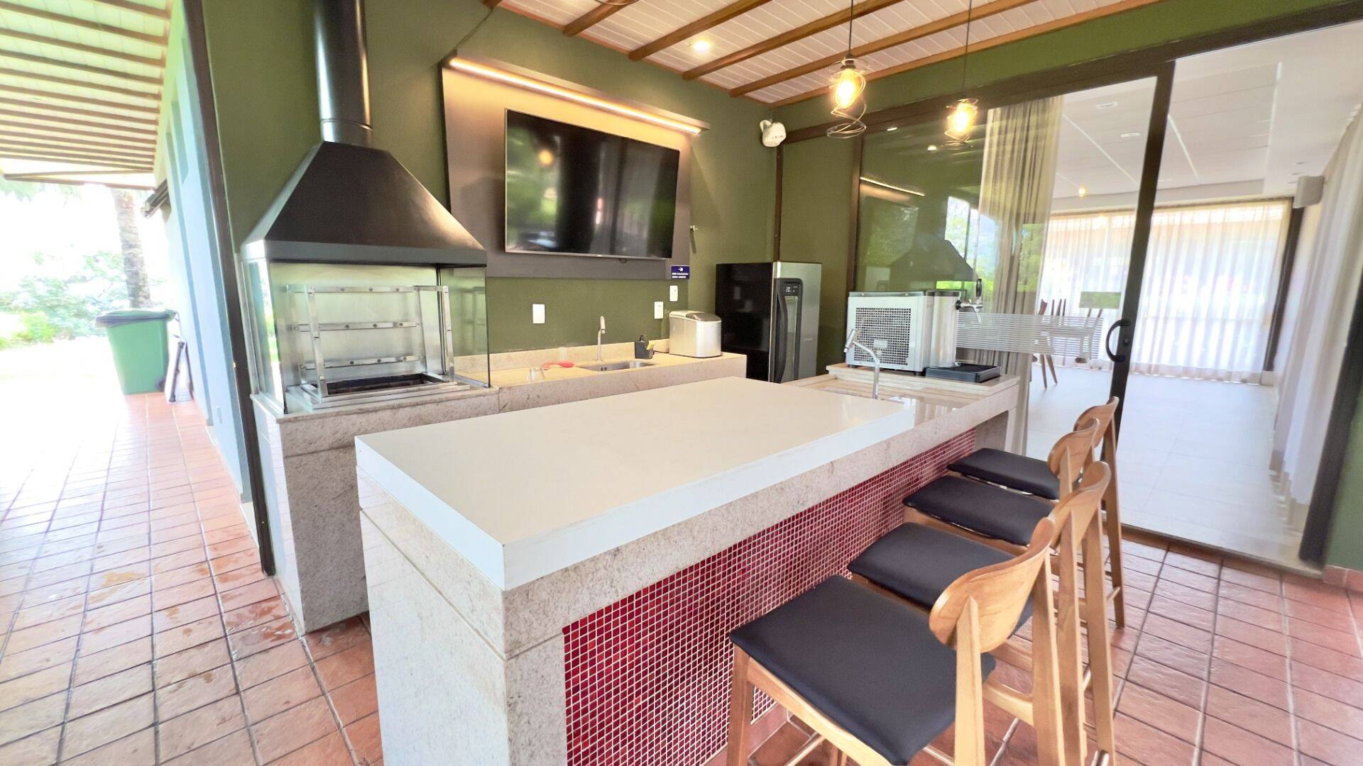 - Sala para dois ambientes- Adega- Cozinha ampla com ilha- Armários planejados- Chopeira- Churrasqueira- Varanda gourmet- Piscina aquecida com iluminação